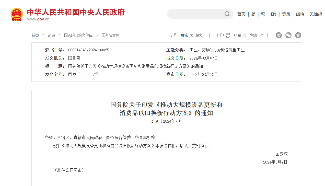 國務院印發的《推動大規模設備更新和消費品以舊換新行動方案》明確鼓勵空調等設備節能改造,為行業帶來政策紅利。