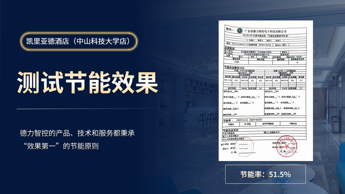 近期,德力智控為中山市凱里亞德酒店節能改造實地打樣,測算節能率51.5%!