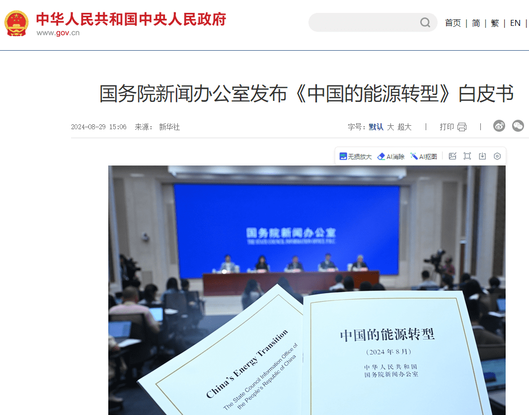 8月29日,國務院新聞辦公室發布了《中國的能源轉型》白皮書。