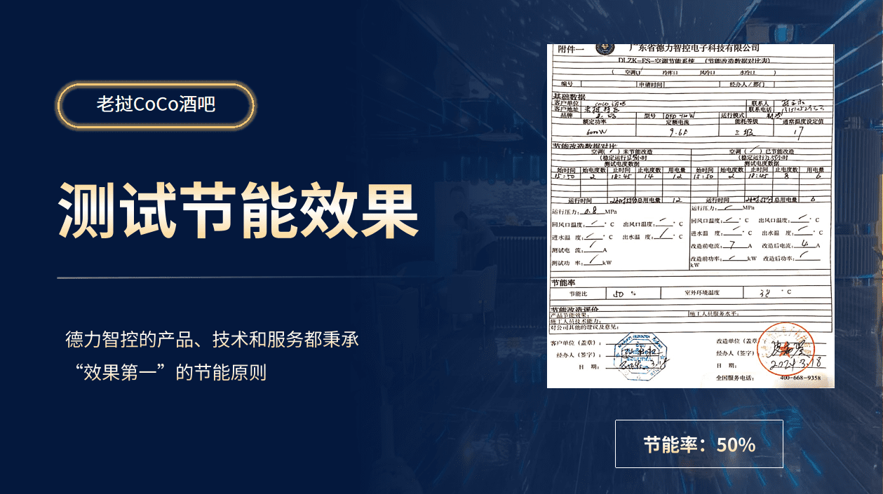 近幾年來,德力智控不僅深耕全國各地的空調節能改造市場,而且不斷挖掘國外節能省電需求。就以東南亞地區為例,德力智控為老撾特區的CoCo酒吧定制節能服務,節能省電50%,空調電費直接省一半!