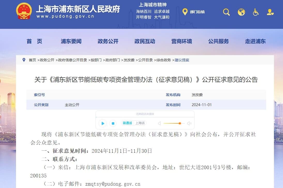 11月1日,上海市浦東新區發改委征求《浦東新區節能低碳專項資金管理辦法(征求意見稿)》意見。