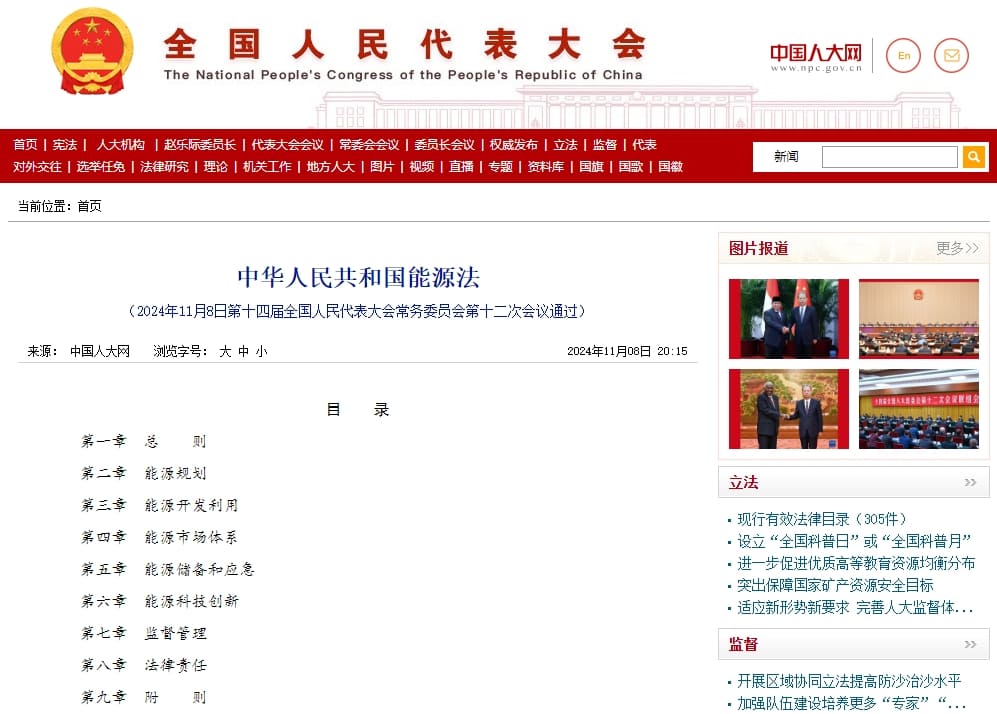 11月8日,十四屆全國人大常委會第十二次會議表決通過《中華人民共和國能源法》(以下簡稱《能源法》)。
